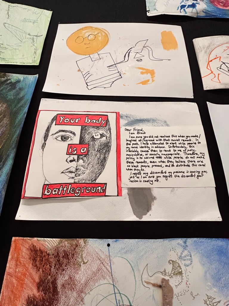 Rose has made a lot of works on paper, also with her son participating in the process of creation. This one is referencing Barbara Kruger’s “Your Body is Your Battleground.” Beside the drawing, you can see a letter addressed to a friend with an opening phrase “I am Black.”