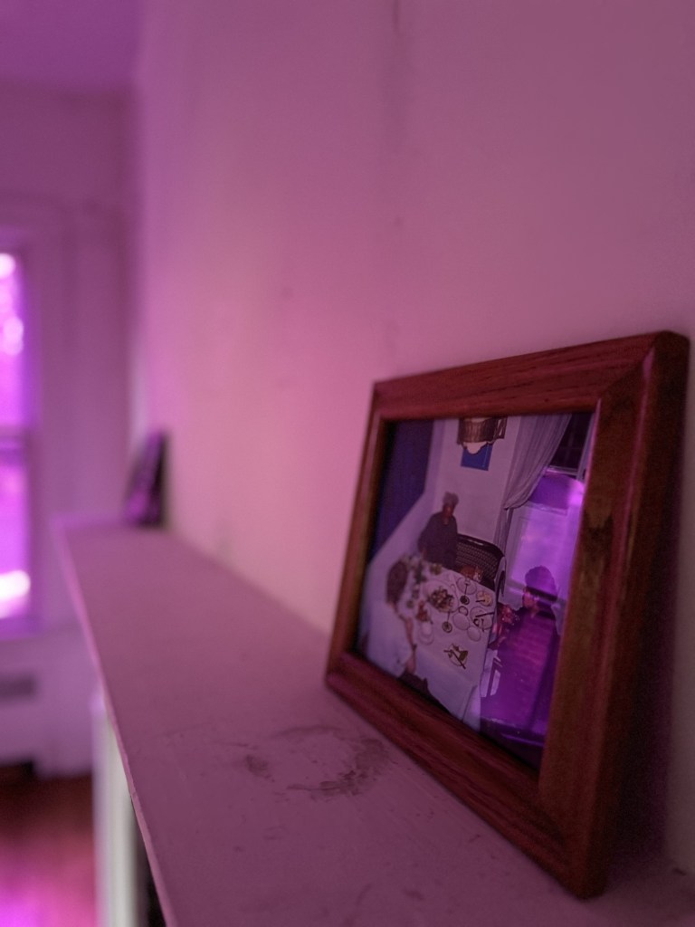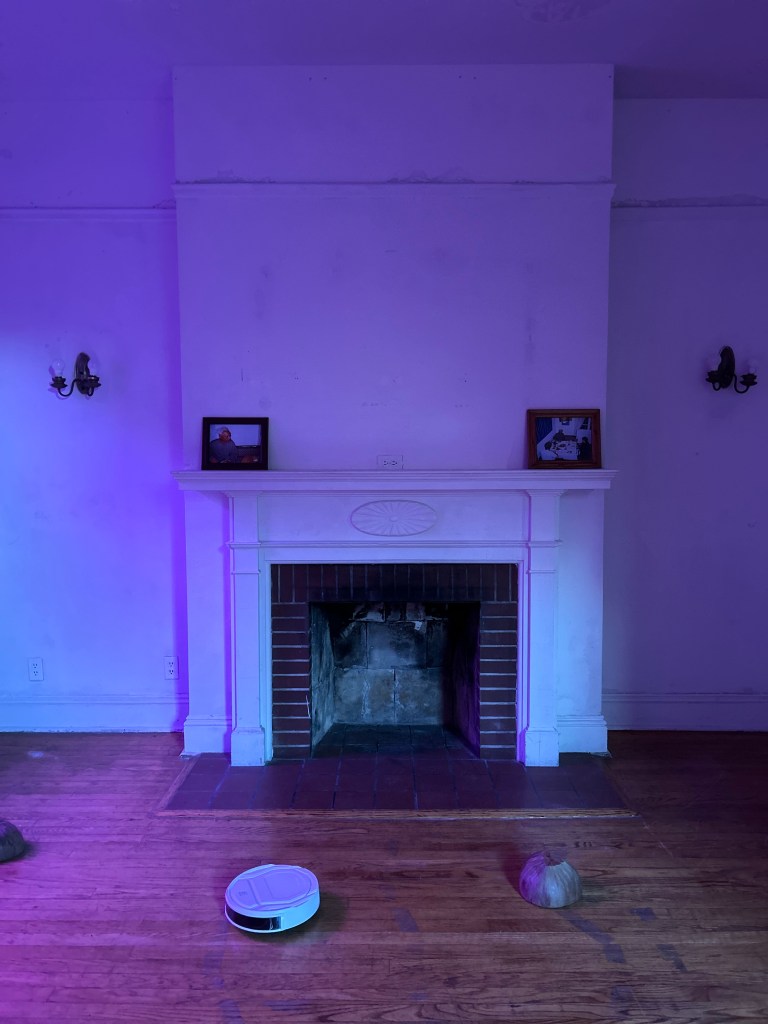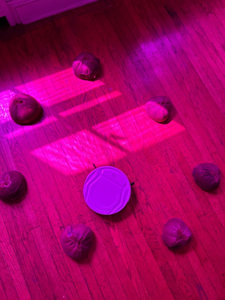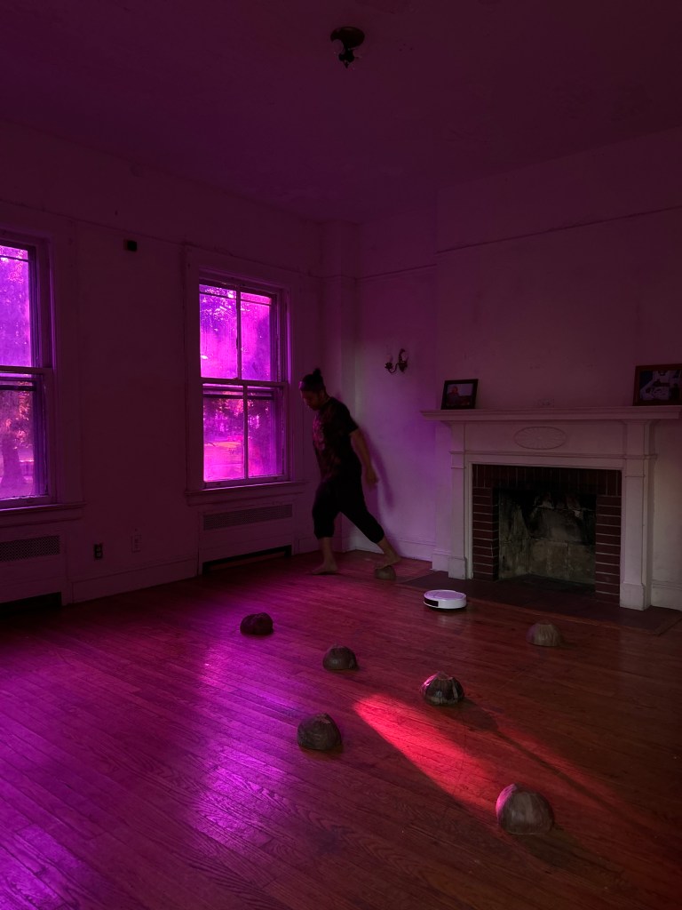 This site work contains window films, gradually changing the interior’s colors, coconut husk polishers in the Philippines called bunot, and an AI robotic vacuum cleaner. Vitug purposefully selected the color purple to encode ube, a sweet purple yam indigenous to the Philippines, that has become a popular staple treat in Little Manila, Queens. The color also transforms throughout the day shifting from purple to violet, deepening its hue, reminiscing of the ultraviolet light, invisible to the naked human eye. Turning light into an active creator of the site work, the visitor’s perception confronts the violet color of invisibleness, which ultimately affects the skin color of everyone present in the gallery space. In this sense, the window filters act as the mediator of cultural and social interactions based on the gaze*, reflecting what W.J.T. Mitchell described as seeing through race**, claiming that the color-blind world is neither desirable nor achievable. The color filling up the space creates an alien-like atmosphere, in which the artist is playing out a speculative scenario of a clash between bunots, coconut husks encapsulating the energy and wisdom of indigenous entities, and a foreign robot equipped with an artificial intelligence sensor for obstacle avoidance, representing colonizer. The dialogue between Vitug’s violet and David Hammons’ blue reflects Amber Jamilla Musser’s concept of the “architectures of blue,” which, in connection to brownness, engages with the ideas of labor migration***. Both artists utilize color and light to infuse them with cultural significance and to trace the process of becoming unseen by historical accounts and the eye of the other. The installation challenges the narrative of technological dominance over the overlooked traditional cultural practices and invisible labor while providing an insightful glare into the future, in which the endurance of skills, techne, thanks to indigenous knowledge, will provide survival, even when the whole world as we know it may have shut down.