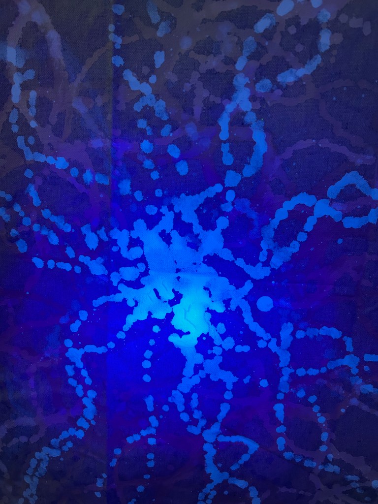 Canvas drop cloth, fluorescent/UV reactive paint, acrylic paint, 3D glasses, LED UV flashlights