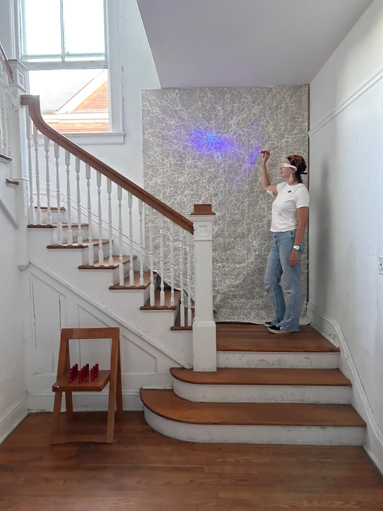 This site work focuses on indigenous wisdom and the limitations of the physical world. Suku is a word in Kapampangan, which is one of the major indigenous Austronesian languages in the Philippines. One of the meanings of suku is an indeterminate end, similar to the human brain’s neural network that has been wired constantly, seeking endlessly and indefinitely within the limits of our able bodies and available technologies. Vitug’s painting on unprimed and unstretched drop cloth hung from the ceiling and draped across the staircase keeps the patterns invisible to the naked eye. The UV flashlights and 3D glasses activate the painting’s hidden perceptual qualities, allowing for a virtual experience. The brain system reflected in the Suku also translates to the power energy pulsating throughout both the body and technology, allowing for sending information.