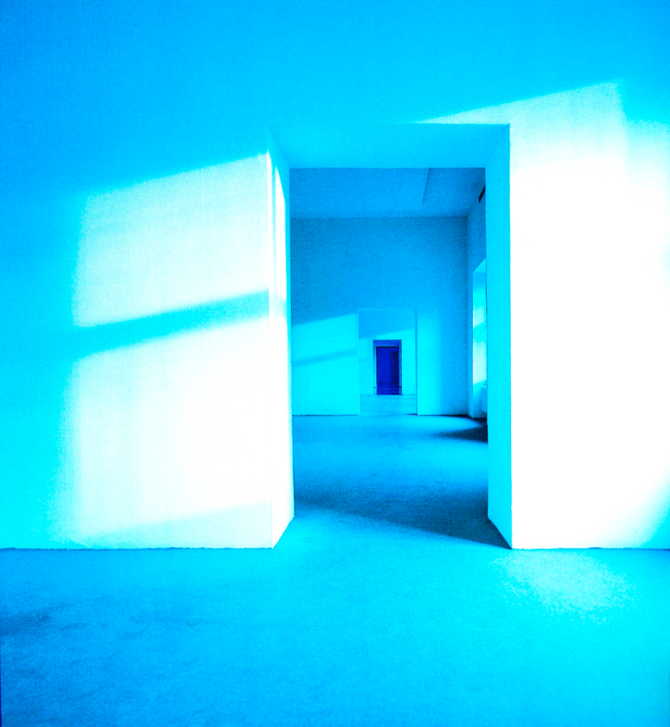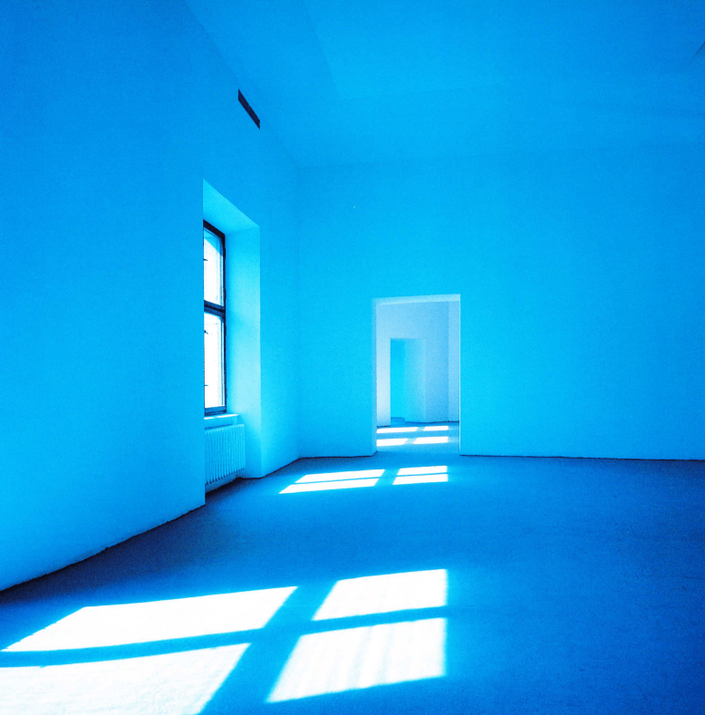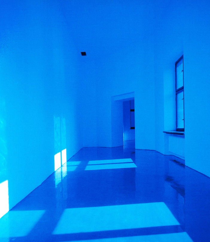 Blackness in Hammons’s work is a matter of blue*, writes Fred Moten. The conceptualized idea of invisible heritage became the starting point for David Hammons’ installation Real Time, realized in 2000 at the Ujazdowski Castle in Warsaw, Poland, curated by Milada Ślizińska. The gradient filters covering the castle’s windows, filling up the space with blue light, along with flooded floors, transformed both the spatial conditions of the interior and impacted the visitor’s perception. As Darby English points out, to experience and see Hammons’ work, one must become part of it**. The color blue encompassed emotions and cultural music code, blue – sad, blue – blues***, as Ślizińska wrote. The blues, combining spiritual songs, field hollers, and call-and- response sequences, is a language in itself, bearing echoes of the struggle against racial oppression and the melancholy resulting from the sound of blue notes, characterized by a lowered tonality. Throughout the filters, transmitting light at different intensities and layers of cultural meanings, Hammons sublimely comments on the historical invisibility of African Americans in cultural institutions, referring to racial segregation, characterized by sociologist and historian W.E.B Du Bois as a color line****. The real time spent in the gallery space for some was a time of contemplation and exploration, while for others, it was a time of confusion while searching for the artworks that were nowhere to be seen. The simple act of drowning the space in blue has turned ephemeral light into something almost tangible and solid, mediating dialogue between the public space and the visitors’ bodies, becoming moving and breathing works of art.