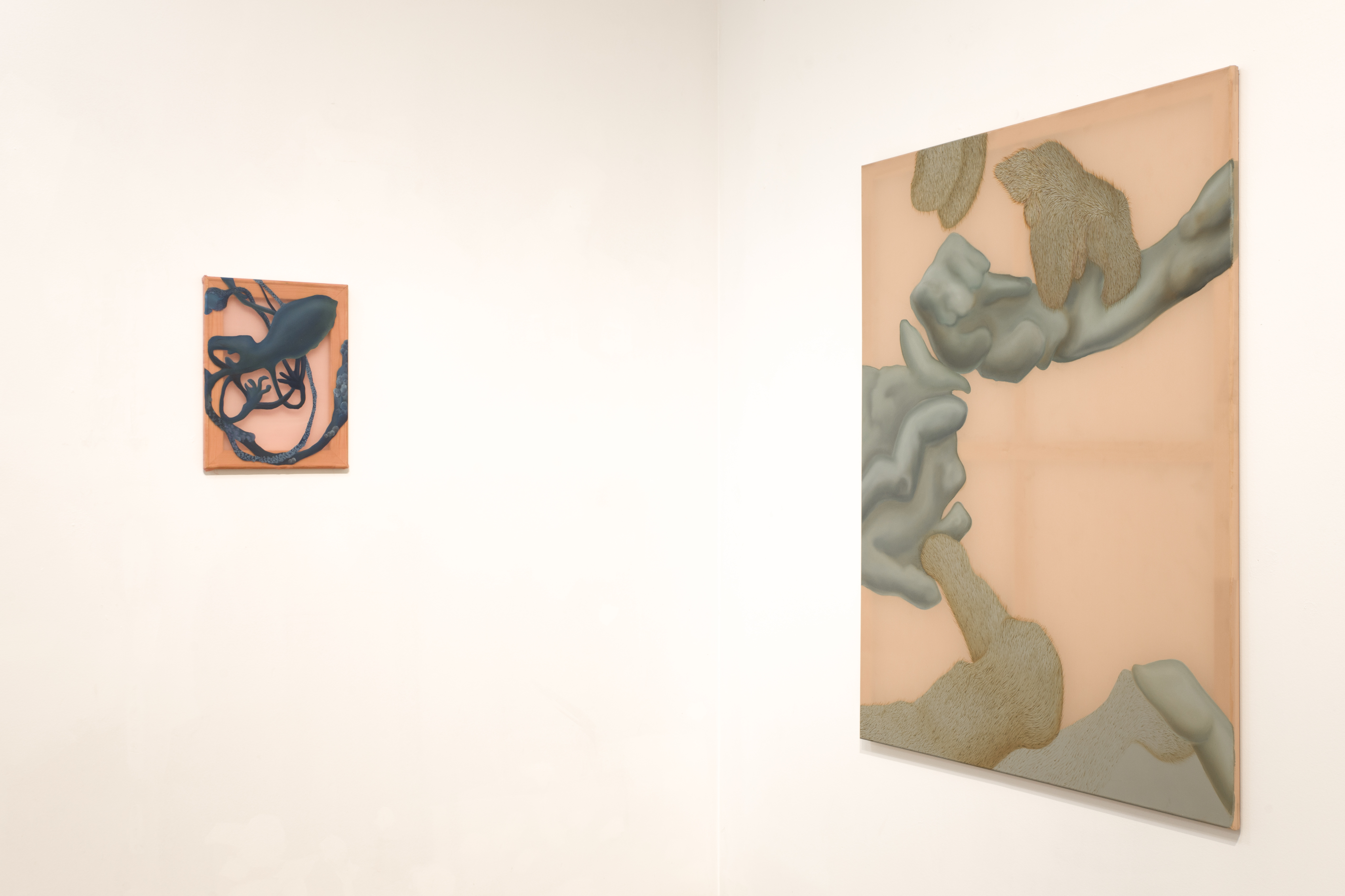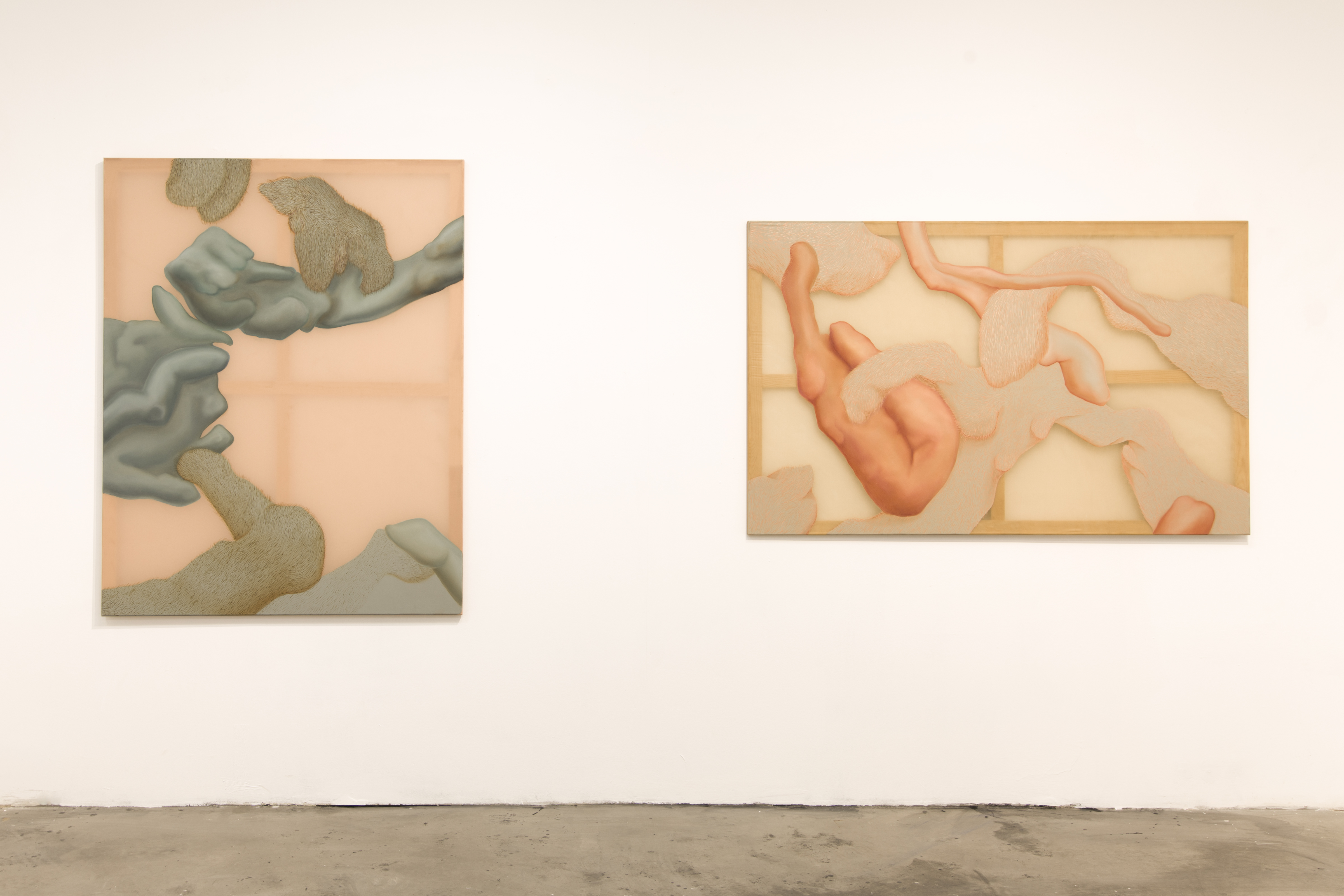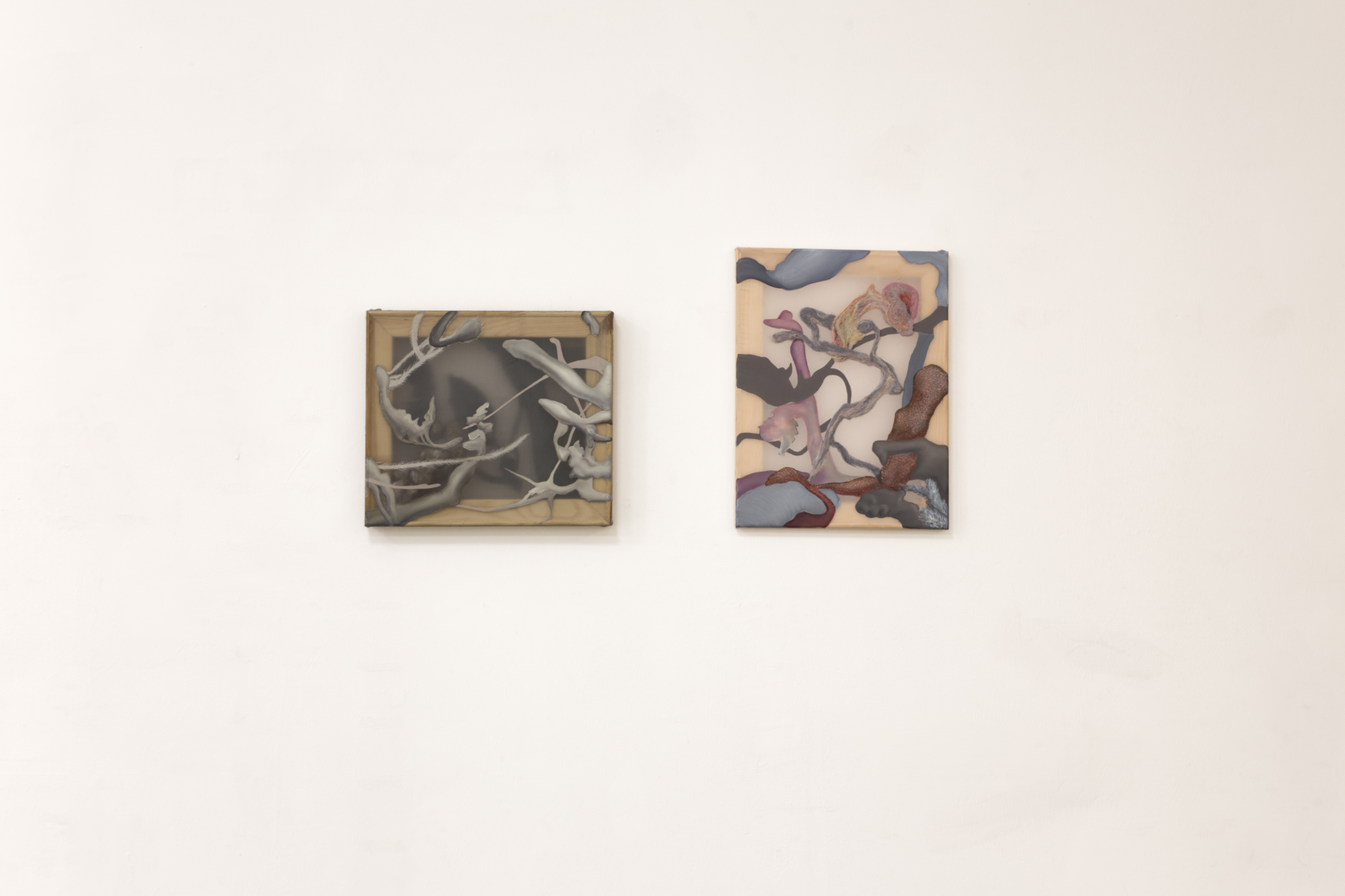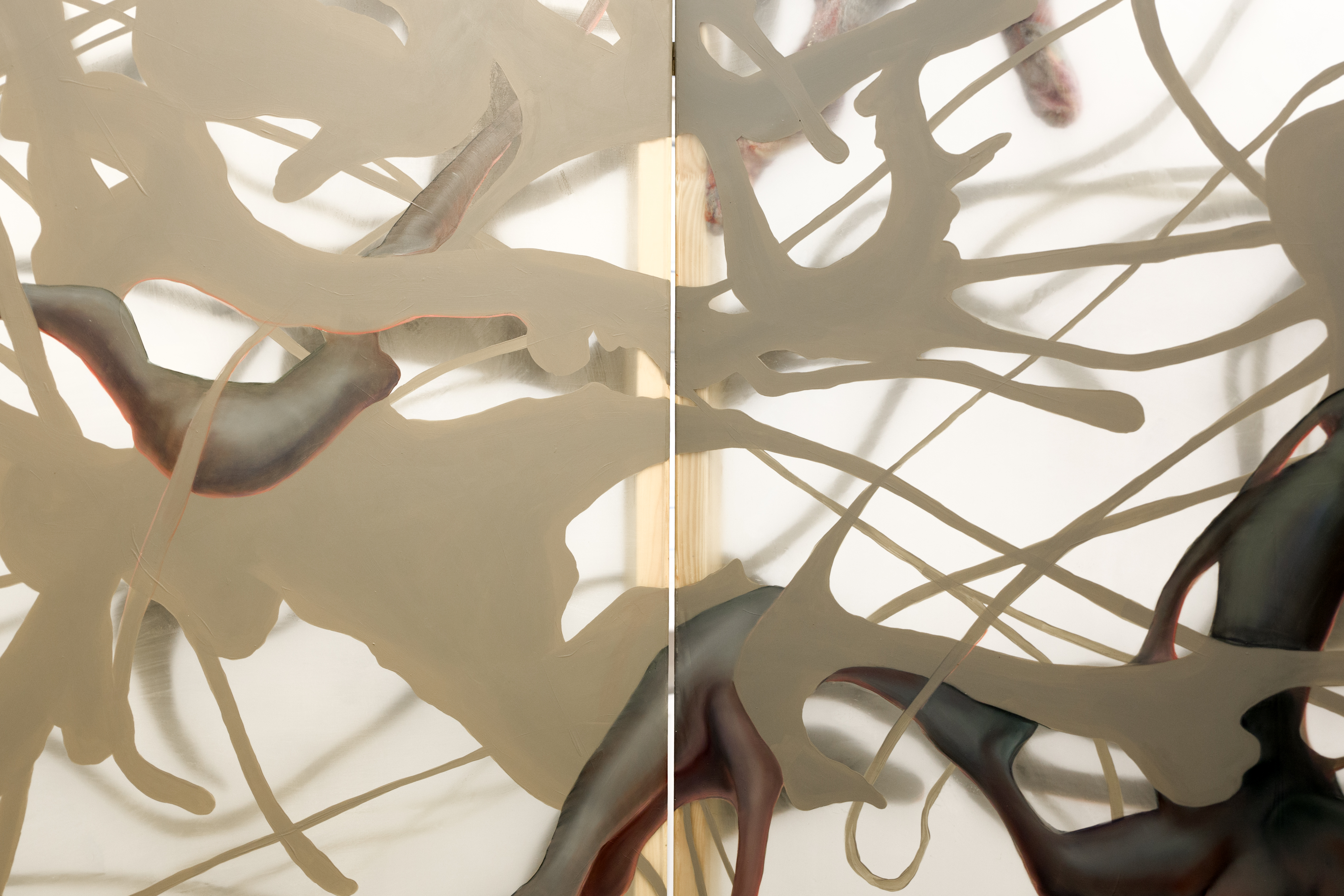 Wystawa Czułe powłoki Julii Królikowskiej otwiera przestrzeń dialogu na cielesność i materialność malarstwa, eksplorując zależność między wnętrzem a zewnętrzem, widzialnym a ukrytym. Artystka konstruuje swoje obrazy na półprzezroczystych tkaninach – organzie, szyfonie i jedwabiu – napiętych na drewniane krosna, które odsłaniają swoją szkieletową konstrukcję. To właśnie owe powłoki, delikatne i podatne na deformację, nasycone farbą i znaczeniami, stanowią wielowymiarowe nośniki cielesnych narracji w twórczości artystki.