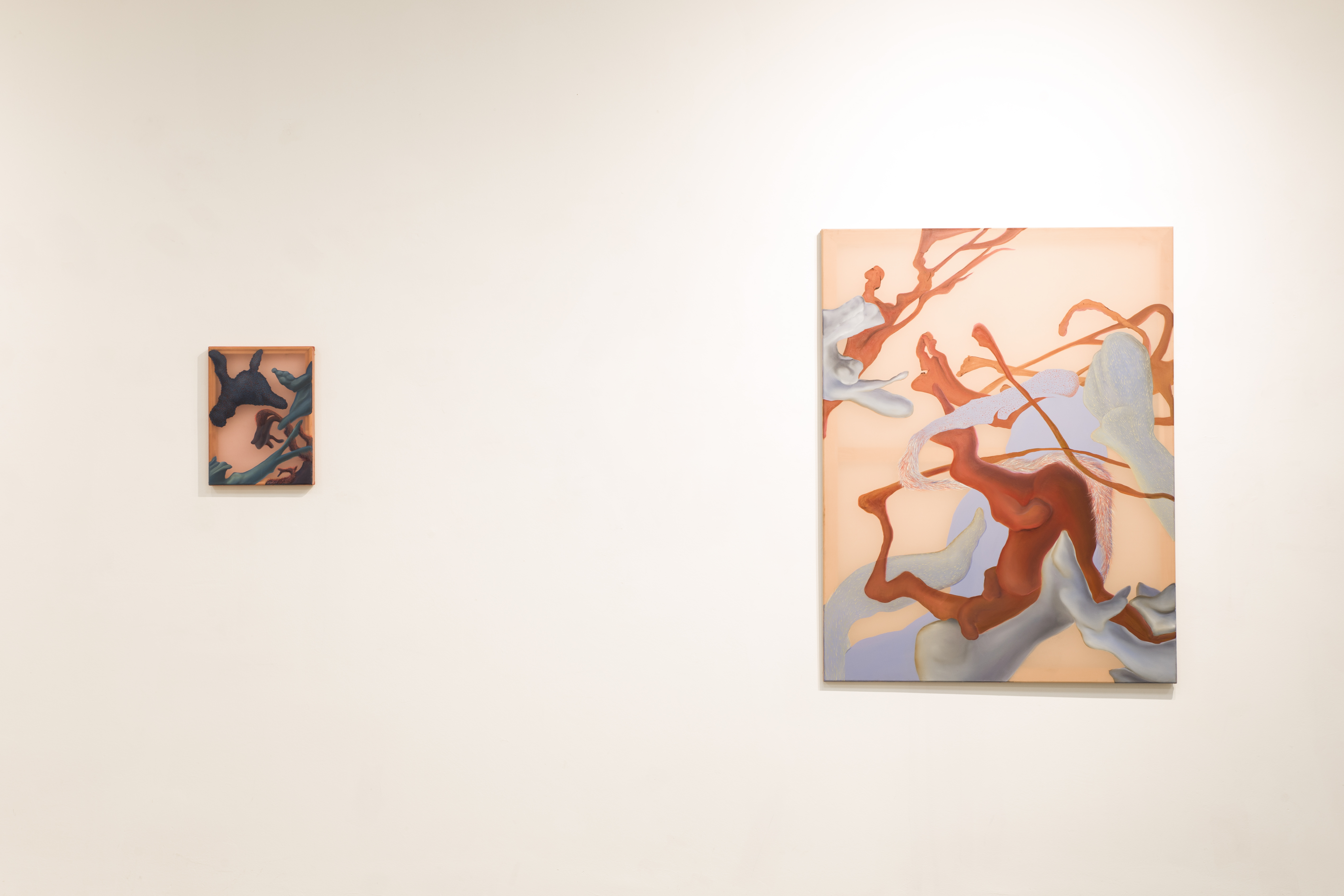 Kompozycje Królikowskiej przywodzą na myśl błony, skórę, włókna mięśniowe czy sierść – mięsiste, haptyczne struktury, które pobudzają wielozmysłowy odbiór dzieł. Pojawiające się na obrazach formy zdają się pulsować, mutować, przeistaczać, jakbyśmy podglądali wnętrze ciała, porośniętego koralowcami lub naroślami. Kolorystyka prac, od cielistych barw, przez szarości, aż po intensywne czerwienie i błękity, sugeruje złożoność materii i jej biologiczne zróżnicowanie. Obrazy artystki nie przedstawiają konkretnego organizmu, lecz raczej stan bycia-ciałem, które, w nieustannej transformacji – puchnie, rozciąga się i ucieka z ramy.