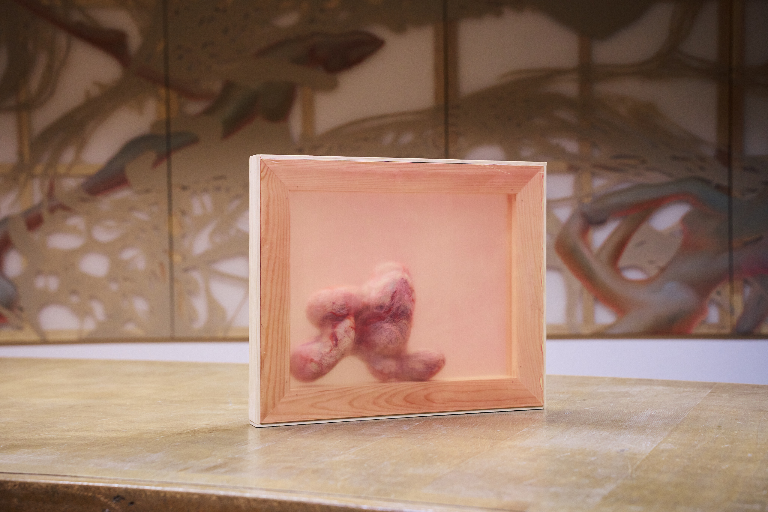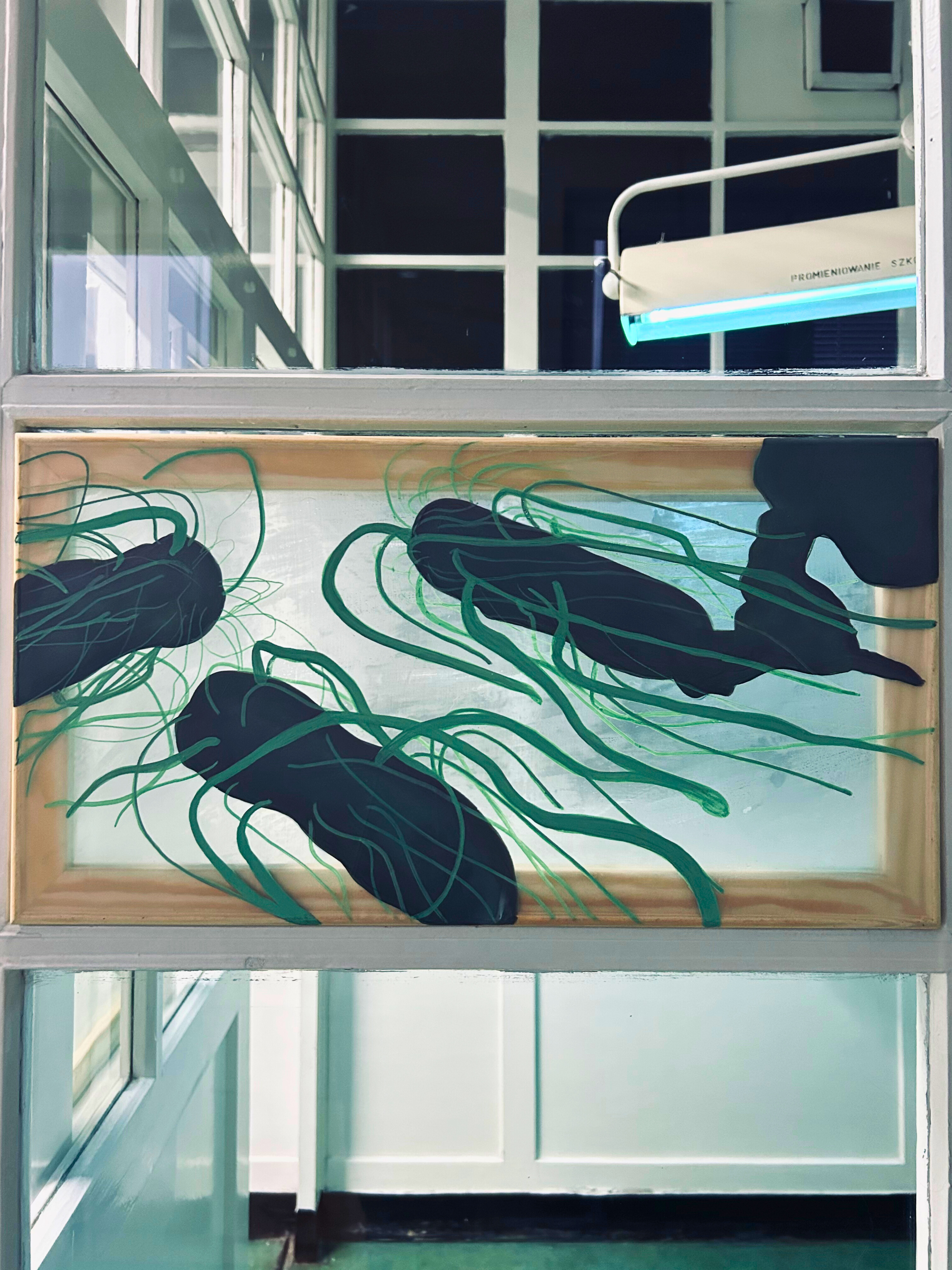 Julia Królikowska’s pop-up exhibition, HOST, showcases her latest paintings and folding-screen painting constructions within the historic interiors of Villa at 3 Wieniawskiego Street. This building, formerly housing the Institute of Hygiene and the Department of Microbiology, is soon set to become the new home of the Institute of Art History at Adam Mickiewicz University. Królikowska’s compositions, drawing inspiration from anatomy, botany, and the underwater realm, create fleshy, layered forms that seep through translucent chiffons and silks. When lit, her paintings seem to animate, changing and evolving as if revealing the inside of a body overgrown with coral.