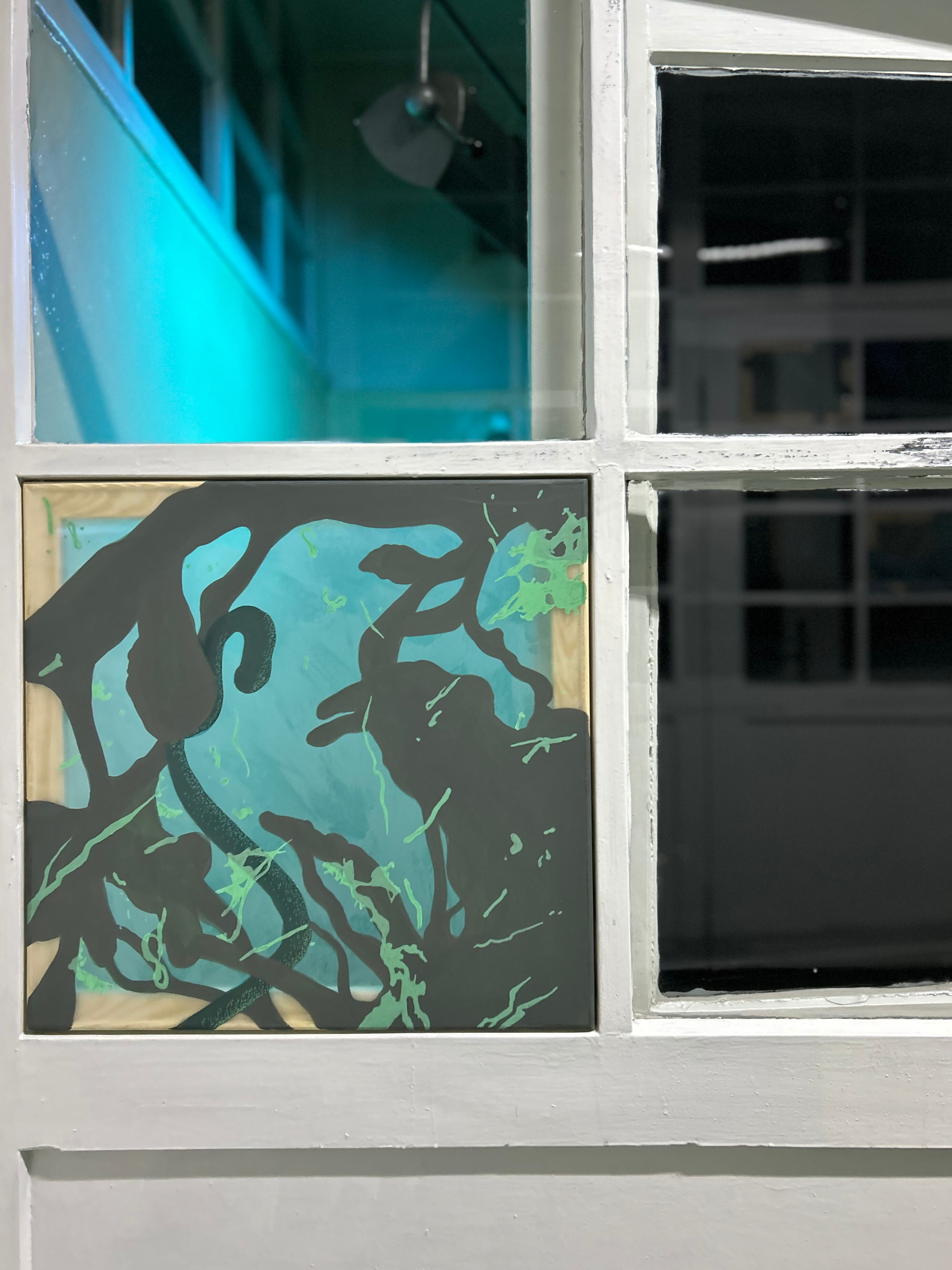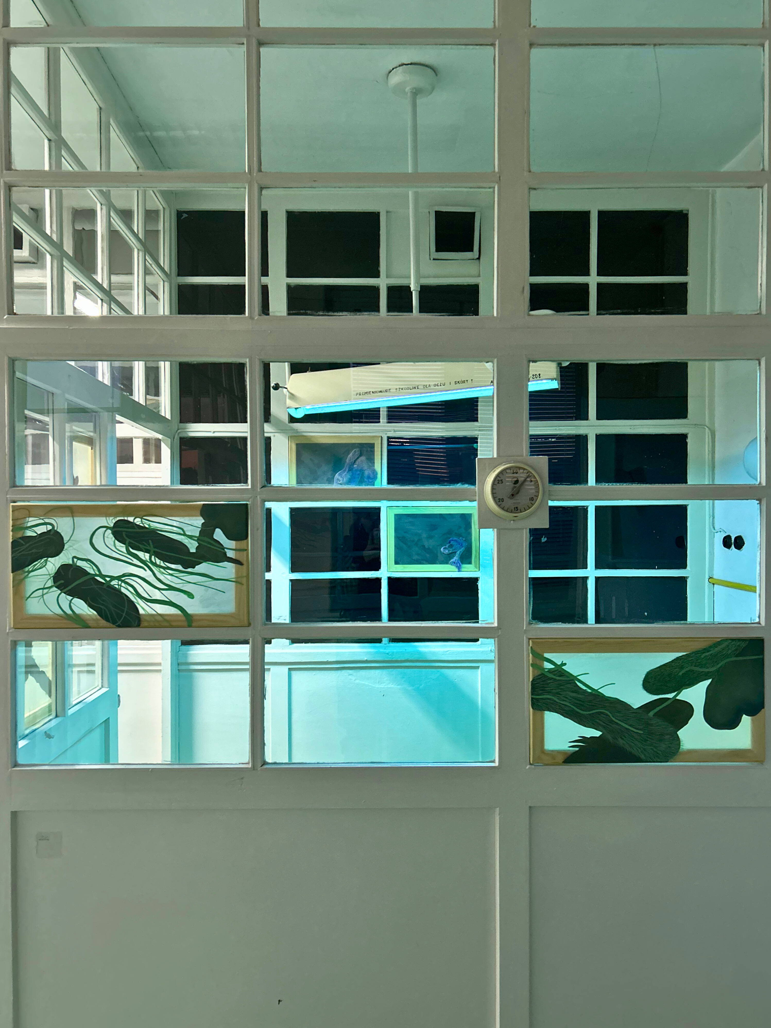 The historical villa is a complex, layered space where a haunting past intertwines with an ever-changing present. HOST seeks to engage in dialogue with the interior and the residual traces of laboratories and medical equipment, actively working to decolonize the space. The site-specific painting installation Crustosum, created especially for the exhibition, draws upon the penetrating gaze of scientific curiosity to speculate on what might be seen beneath the microscope. Yet this vision is disrupted by splashes of neon paint evocative of toxic blood that contaminate the image and link the act of looking to a gesture of violence and intrusion.