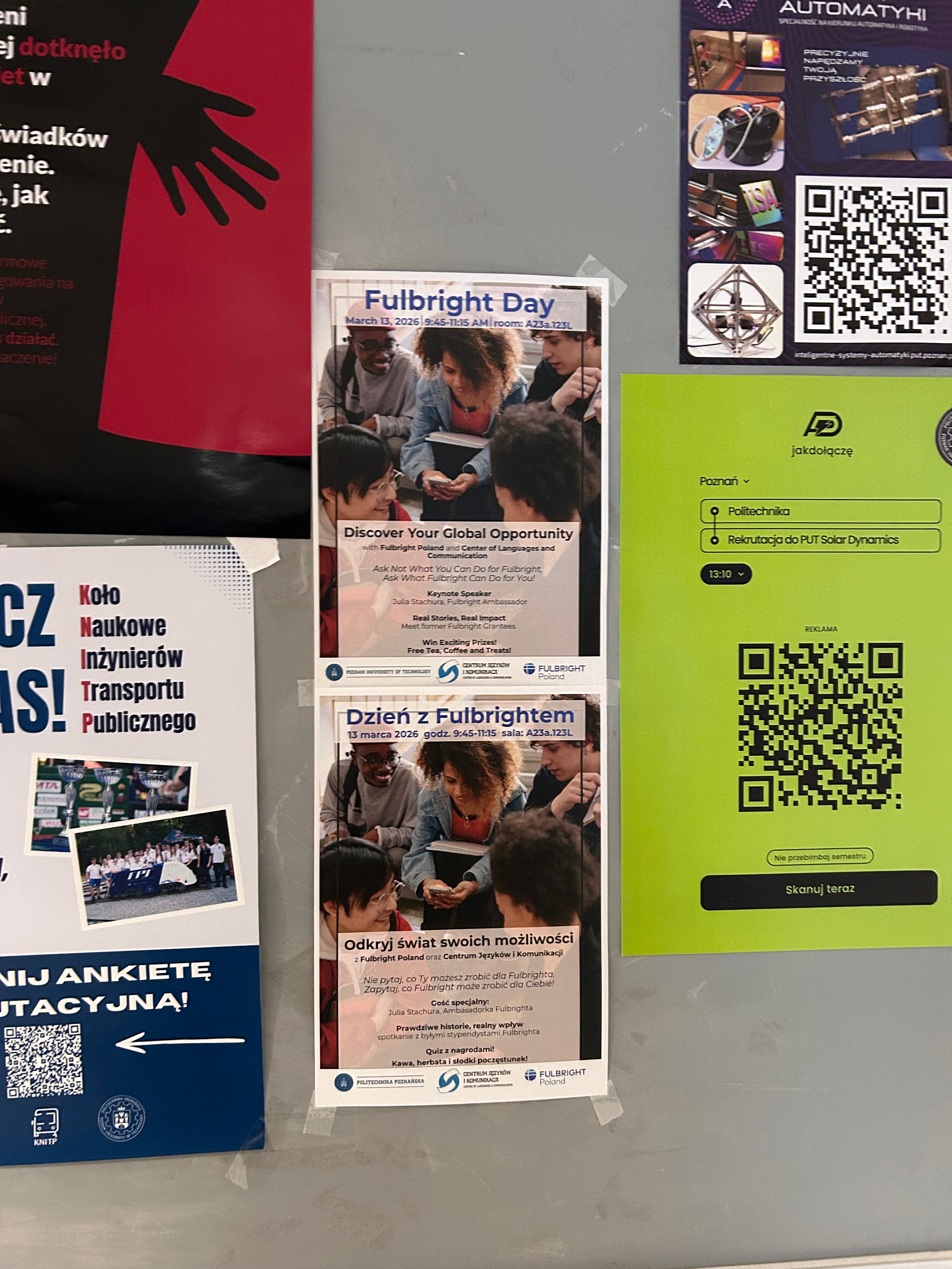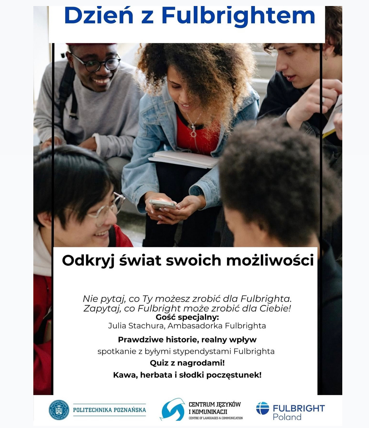 13 marca miałam przyjemność uczestniczyć w inspirującym poranku ze społecznością Politechniki Poznańskiej. W Centrum Języków i Komunikacji odbył się Dzień Fulbrighta, podczas którego zaprezentowałam ofertę stypendialną oraz poprowadziłam sesję warsztatową.